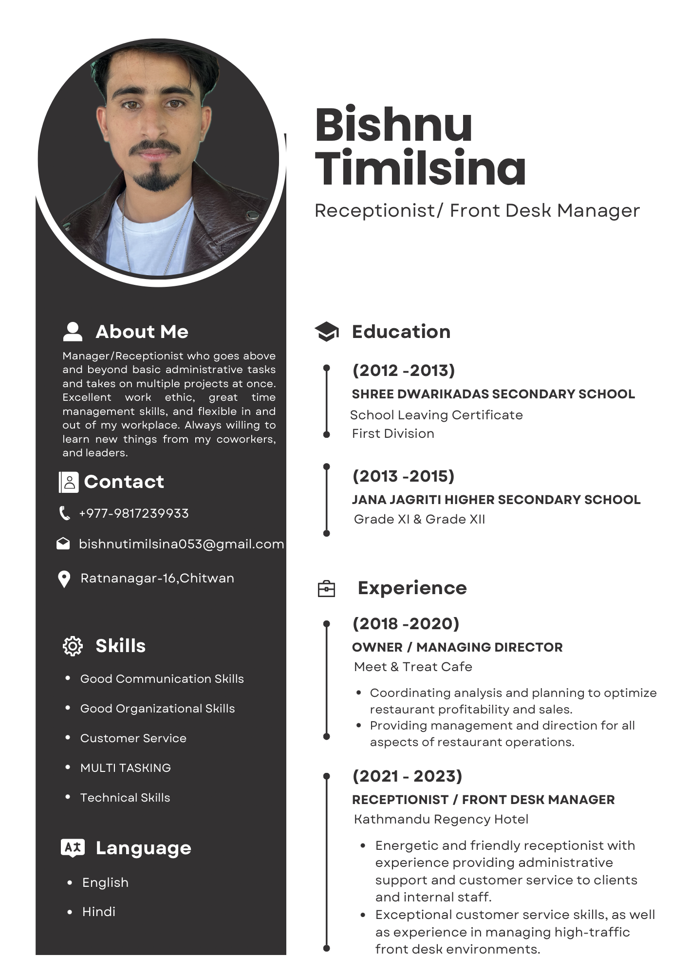 I’m Bishnu Timilsina, a dedicated Front Desk Manager & Receptionist with a strong focus on professionalism, efficiency, and customer service. I specialize in managing front desk operations, ensuring seamless guest experiences, and maintaining a welcoming environment.